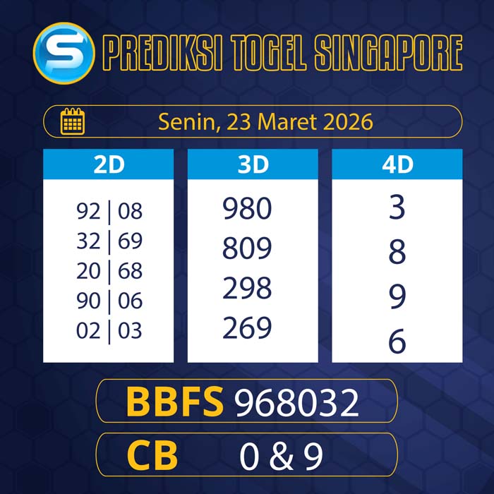 PREDIKSI TOGEL SINGAPORE TERBARU SENIN 23 MARET 2026 – Selamat bergabung untuk semua sobat tercinta di halaman yang akan membantu sobat dalam menjalankan pasaran singapura hari ini.